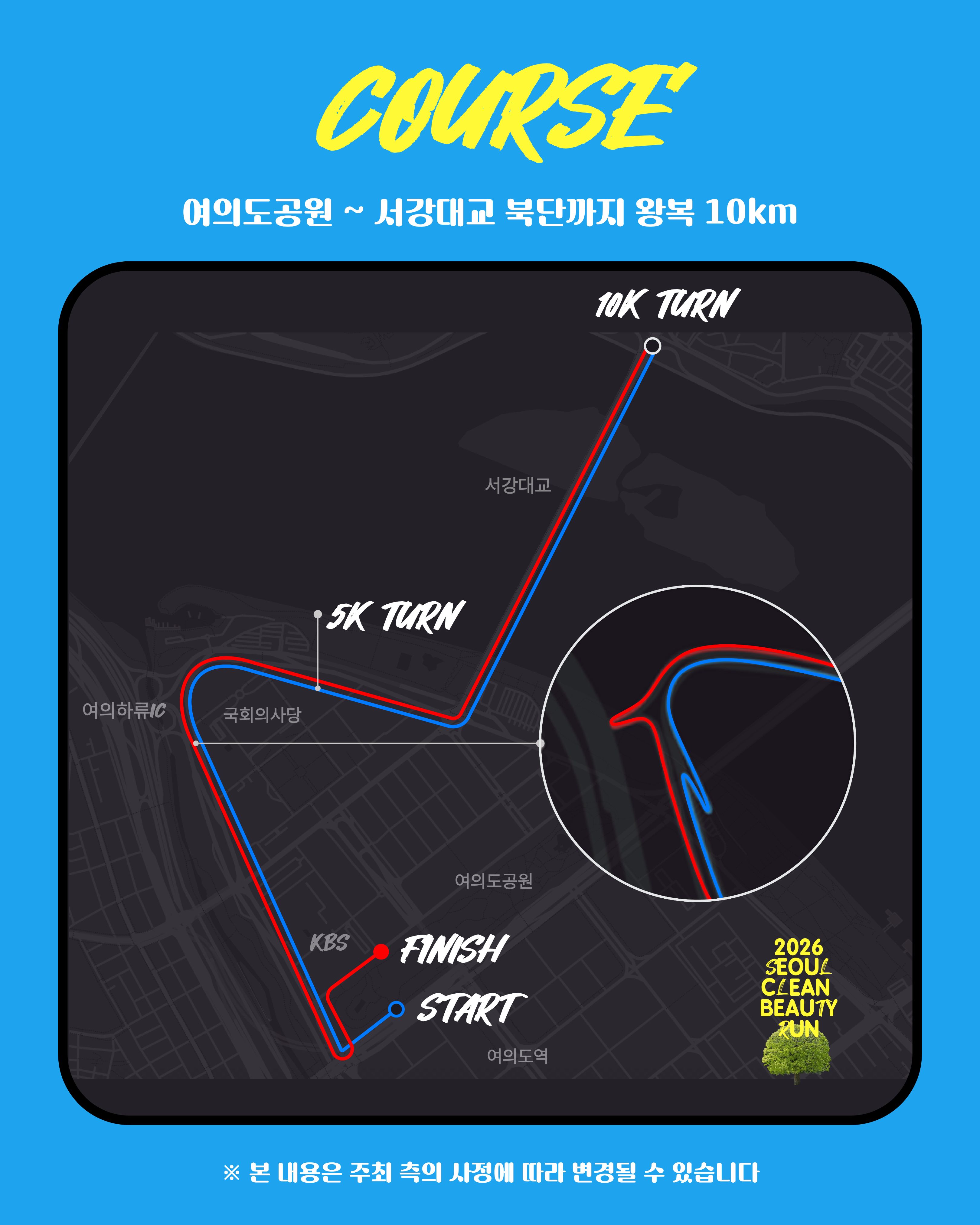 여의도공원 문화의마당(출발) → 서강대교 북단(반환) → 여의도공원 문화의마당 (도착)
